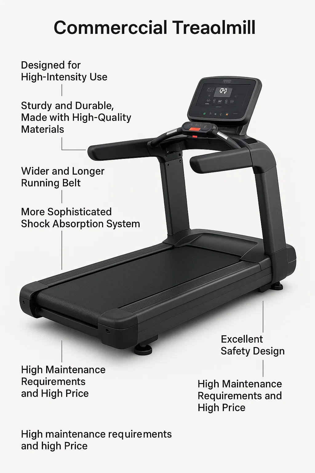 Кроме того, из-за высокой интенсивности использования они требуют более профессионального и регулярного обслуживания (например, смазка бегового полотна и проверка износа деталей) для обеспечения долговременной стабильной работы. Тренажерные залы обычно заключают договоры на техническое обслуживание с поставщиками.